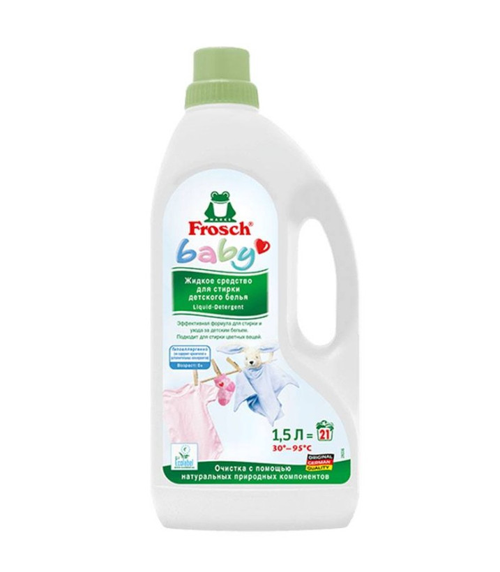 مایع لباسشویی کودک frosch یک مخصوص شست و شوی لباس نوزادان در دمای بین 20 تا 95 درجه سانتی گراد است به خوبی و بدون ایجاد حساسیت هر نوع آلودگی و لکه های سخت را از بین می برد