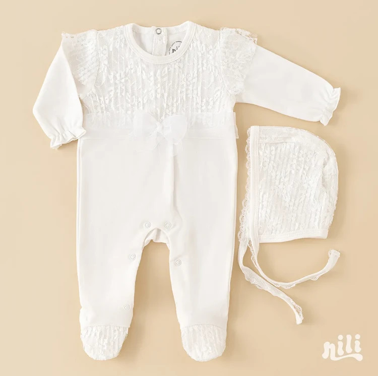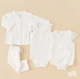 اقلام داخل بسته بندی: زیردکمه آستین کوتاه، زیردکمه رکابی، سرهمی جورابدار، مانتو، شلوار، پیشبند، کلاه گرد، یک جفت جوراب، یک جفت دستکش، آروغ گیر، دورپیچ نخی کلاه دار