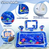 سفره آکواریومی اسباب بازی دخترانه و پسرانه با طرح حیوانات دریایی و زمینه آبی رنگ با صفحه ای مستطیل به همراه آینه ای بی خطر و جغجغه هایی که در دو طرف آن کار شده است که برای بازی دلبندان بالای 3 ماه شما مناسب می باشد. در پشت این محصول دو درپوش قرار گرفته است با اندازه های مختلف قرار گرفته است. قسمت بیرونی را به آسانی توسط هوا و قسمت درونی آن را با آب پر کنید که در نهایت حالت آکواریومی به خود می گیرد.